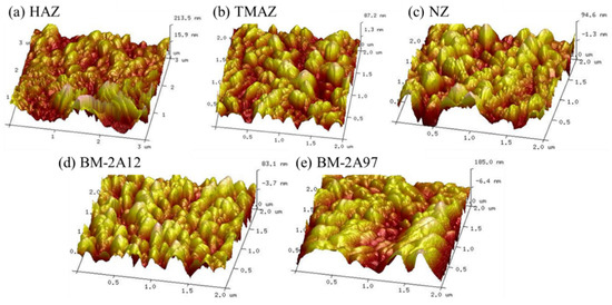 AFM images of CSA-LDH-PF film on the different FSW joint areas. (a) HAZ, (b) NZ, (c) TMAZ, (d) BM-2A12 and (e) BM-2A97.