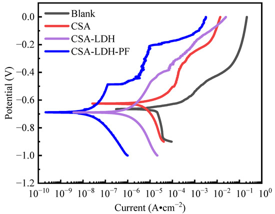 To investigate the corrosion resistance of the aluminum alloy sample protected by the CSA-LDH-PF film, polarization curves (seen in Figure 7) were tested in 3.5 wt.% NaCl solutions and the fitting results of the polarization curves are shown in Table 5. There is little distinction between the corrosion potentials (Ecoor) of the different samples. Nevertheless, compared to the corrosion current (icoor) of the Blank aluminum alloy sample without surface treatments (1.267 × 10−5 A·cm−2), the icoor of the sample after anodizing is nearly ten times smaller (1.657 × 10−6 A·cm−2), while the CSA-LDH film generated by LDH sealing could further decrease the icoor to 2.483 × 10−7 A·cm−2. However, the promotion of corrosion resistance induced by the LDH sealing is still dissatisfactory due to the imperfect sealing effect of the fenestra. During the PF modification process, more cracks were covered or connected by the reaction products of PF and LDH. As a result, the icoor of CSA-LDH-PF film is significantly reduced to 7.150 × 10−9 A·cm−2, indicating superior corrosion resistance.