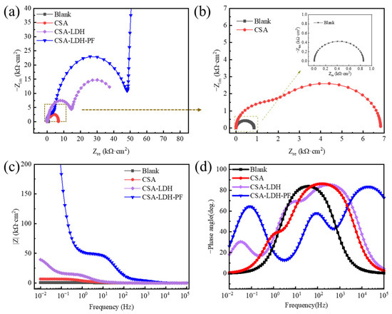 Impedance spectroscopy was carried out to get more insight into the corrosion kinetics of aluminum alloy samples in 3.5 wt.% NaCl. Not unexpectedly, the capacitive arc radius of the Blank sample is the minimum, while the CSA samples come second (Figure 8a-b). After the LDH sealing and PF modification, the capacitive arc radius further increases significantly. The results of the bode plot are in line with the above analysis. The blank sample exhibits the minimum impedance, while subsequent the anodization, LDH sealing, and PF modification process can significantly increase the impedance, especially in the low-frequency region (Figure 8c). The information on the barrier layers of the samples can be seen from the phase angle plot (Figure 8d). For the blank sample, there is only an original barrier layer indicating the impedance induced by the metal surface. A new barrier layer at around 100 Hz can be attributed to the anodic oxide film after anodization. Further, the LDH sealing film endowed the surface with an extra barrier layer in the lower frequency, and the extra barrier layer can be signally strengthened by PF modification.