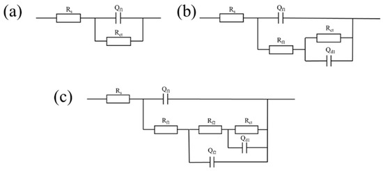 Equivalent circuit fitting diagrams of the (a) Blank, (b) CSA, and (c) CSA-LDH and CSA-LDH-PF samples. RS: solution resistance, Rf: film resistance, Qf: capacitance of native oxidized film/passivated film, Rct: charge transfer resistance, Qdl: double layer capacitance.