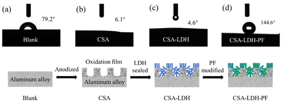 The contact angle was measured to verify the hydrophobicity of the CSA-LDH-PF film, and the results are shown in Figure 10. The water drop on the blank sample (after grinding and polishing) exhibits a contact angle of 79.2° (Figure 10a). After anodizing, the surface of the aluminum alloy was replaced by a porous oxidation film, which made the surface hydrophilic and decreased the contact angle to 6.1° (Figure 10b). LiAl-LDH nanosheets (Li2[Al2(OH)6]2CO3 ∙ nH2O) with surface hydroxyl groups and bound water were generated on the oxidation film during the LDH sealing process, which made the surface more hydrophilic (contact angle = 4.6°). After subsequent modification by PF, the surface hydroxyl groups reacted with PF and transformed to hydrophobic CF3(CF2)5CH2CH2Si(O-)3 [34] (seen in Figure 4). The water drop exhibited a large contact angle of 144.6° on the low-surface-energy CSA-LDH-PF film (Figure 10d). The hydrophobicity of the CSA-LDH-PF film is beneficial to separate corrosive medium from the samples and thus further enhances corrosion resistance.