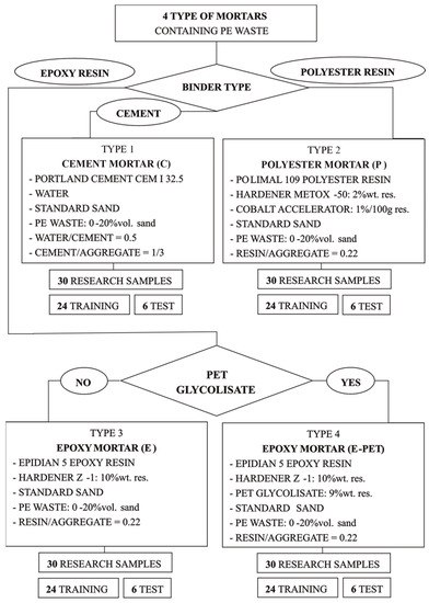 In the case of polyester resin, additionally a 1% cobalt accelerator was used. The basic aggregate in all types of mortar was standard quartz sand with a grain size of 0–2 mm. It was partially replaced (0–20% by volume) with an agglomerate obtained on the basis of waste polyethylene bags. Sand substitution took place proportionally in each fraction. The scheme for obtaining and division of mortars is presented in Figure 1.