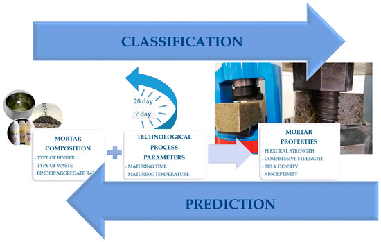 The database is a selected and structured set of information on the material, technology, its properties, and areas of use. The database can be presented as a matrix composed of rows and columns that are filled with not only numbers, but also quality characteristics, names, etc. The composite database consists of input data that inform about what is known about a given material and its execution, and output data that can be the subject of analysis, classification, prediction, etc. The creation of a laboratory database and the use of knowledge mining techniques from these databases using various techniques (discriminant analysis, decision trees, cluster analysis) allows for the development of models that will allow for prediction of features in future materials, without the need to perform tests. This fact is particularly important in the case of building composites, for which, in order to determine their specific properties, a series of destructive tests must be performed, which is laborious and generates costs. This approach is also consistent with the principles of sustainable development. Exploratory methods also enable the classification of composites described by a given set of parameters (features, input data) into an appropriate group. The more composites tested using different types of waste materials and with different matrices, the larger the database, the wider the analytical possibilities and the richer the knowledge about these materials. Such databases are most often built with an incremental method, i.e., each designed and tested composite is entered as a new row into the existing database.