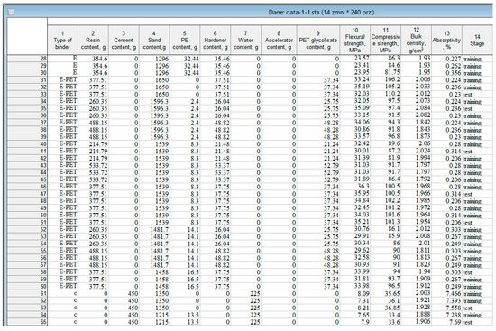 The input table contained 14 columns (Figure 3). The first column contains information on the binder used to obtain the mortars (Type of binder—marked, respectively, as c for cement mortars, E for epoxy mortars, E-PET for epoxy mortars modified with PET waste glycolysate, and P for polyester mortars). The type of binder was the so-called grouping variable that identifies the type of mortar. The contents of columns 2–9 describe the composition of individual mortars. The following columns (10–13) of the table summarize the values of flexural strength, compressive strength, volumetric density, and water absorption determined for the samples prepared. The last column of the table (Stage) contains labels on the basis of which a system will be created and assessed, classifying mortars into four groups (types), distinguished in the first column of the table. This variable is a sample identifier and allows us to distinguish between the sample intended for analysis (Training) and the sample intended for cross-validation (Test), which allows for the assessment of the quality of the classifier.