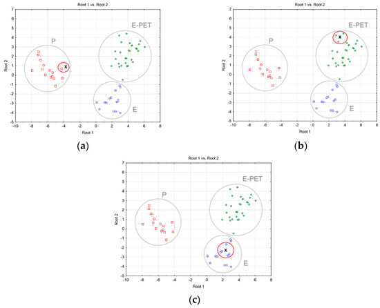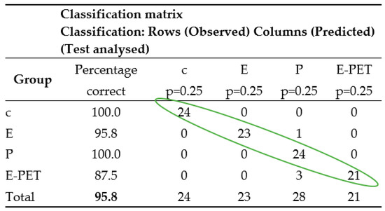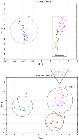 The results of the Chi-square test presented in Table 5 show that the three discriminant functions are statistically significant (p < 0.05) and all three can be interpreted. The determination of the canonical discriminant functions was carried out on the basis of the calculated standardized coefficients of these functions, which are summarized in Table 6. From the last row of Table 6 it can be concluded that the first function is responsible for more than 96%, and the second for more than 99% of the explained variability (variance) hidden in the data. Therefore, these two functions are important. The first differentiates mainly cement mortars (the canonical average presented in Table 7, equal to −14.454, is definitely different from the others). Similarly, it can be concluded that the second function mainly distinguishes epoxy and the third polyester mortars.