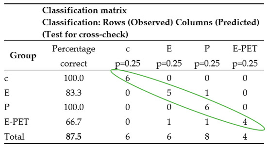 The results summarized in Table 4 provide two valuable pieces of information. First of all, the values of the Wilks lambda parameter are close to 0, which shows the very good discriminant power of the currently built model. Second, the parameter of the Wilks’ partial lambda, determines the specific contribution of a given variable to the process of group discrimination. The lowest value of this parameter for flexural strength confirms that this property is the main variable that enables the discrimination of mortars differing in the type of binder. Subsequently, compressive strength and absorptivity make the greatest contribution to overall discrimination, while bulk density contributes the least.