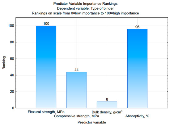 In the case of the studies described in this article, 96 randomly selected mortar samples (marked in the Stage column with the Training label) constituted the training sample used in the tree construction stage, while 24 cases (marked as Test) formed a test group that was used to evaluate the constructed tree. The analysis was started by generating a graph containing a ranking of predictors (Figure 9), which allows one to assess the accuracy of all four variables, i.e., properties that are the results of laboratory tests.