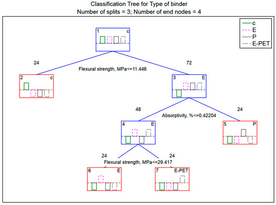 The tree has four end nodes (decision tree “leaves”) that indicate the type of group identified. It can be observed that cement mortars form a well-insulated set, because the shortest decision path leads to this “leaf”, while to the remaining ones it is much longer. Flexural strength turned out to be the most important decision-making attribute, as this feature is tested in the tree root. Subsequently, water absorption value is tested. The other two features (compressive strength and bulk density) turned out to be unnecessary during the decision tree analysis and do not appear in the constructed classification rules. In this case, for the purpose of correct classification, these properties do not need to be determined in the laboratory, which can significantly speed up research work when designing new composites. However, because the database is constantly being updated with new cases that it is planned will be added to the database, the values of all properties should be marked.