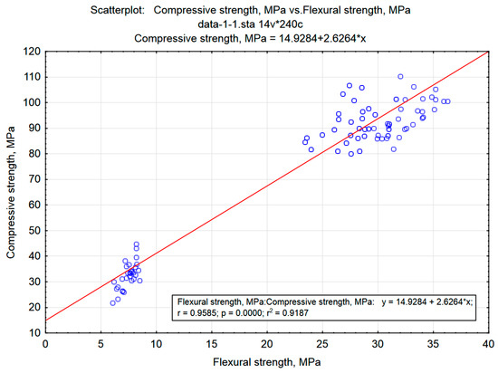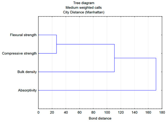 A reflection of this division is a tree diagram created for the same data, but taking into account grouping by columns (variables, i.e., mortar properties) (Figure 12). Here, the properties of the mortars formed the four clusters. With a cut-off at a distance of approximately 170, a division into a cluster formed by absorptivity and a group (cluster) of other properties arises. The latter, at a distance of approximately 110, is divided into the next two clusters: bulk density and strength parameters. At a distance of approximately 25, a division into flexural and compressive strength can be distinguished. The assessment of the bonding distance (very small) between the strength variables shows that these variables are located close to each other in the feature space, which shows that they are correlated. This fact is confirmed by the location of the points on the scatter plot shown in Figure 13 and the results of the variance analysis (e.g., similar values of the F parameter) presented in Table 11.