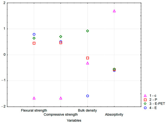 By analyzing the average diagrams of each cluster included in Figure 14, it can be concluded that a cluster containing only cement mortars definitely stands out from the others, both in terms of strength and water absorption parameters. In turn, in cluster 2, where only polyester mortars are located, the largest differences are in volume density. There are also differences in the average strength parameters of the resin mortars. It should be emphasized that these conclusions are appropriate for the results of the discussion presented above, i.e., when discussing Figure 4.
