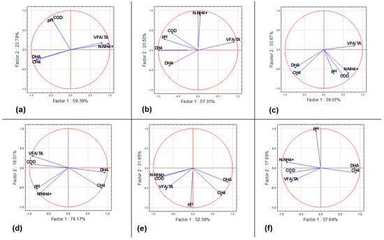 Distribution of dehydrogenase activity as well as chemical properties in the tested samples: (a) WF—control; (b) WF + PLAG; (c) WF + PLAP; (d) WFC—control; (e) WFC + PLAG; (f) WFC + PLAP, in two PCA axes. Legend: DHA—dehydrogenase activity, VFA/TA ratio—volatile fatty acids-to-total alkalinity ratio, N-NH4+—ammonium nitrate, COD—chemical oxygen demand.