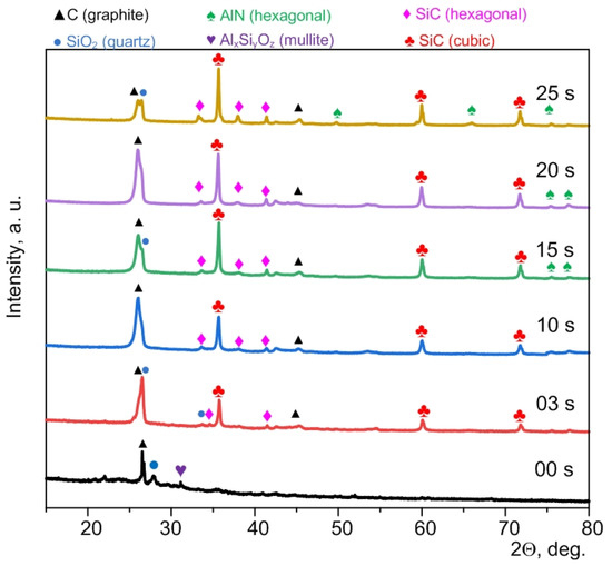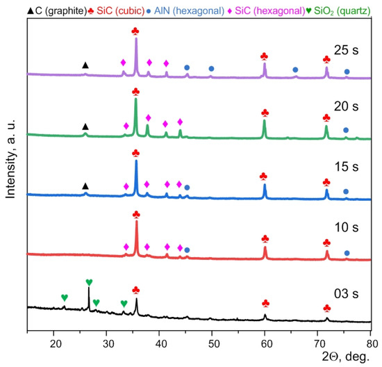 The diffraction patterns of the samples synthesized via the DC arc discharge method showed the following main phases: two phases of C (graphite), SiC (hexagonal), SiC (cubic), and probably AlN (hexagonal) due to the superimposition of a number of diffraction maxima. Quantitative analysis of the studied samples is indicated in the in the Supplementary Materials (Table S1). In a sample of 25 s, a decrease in the graphite phase can be observed compared to the rest of the samples; this is explained by the fact that with a duration of synthesis of 25 s, a lot of powder based on silicon carbide and graphite sinter are formed in the crucible, which was removed mechanically. The two carbon phases are formed due to electrical erosion of the anode with mass transfer from the anode to the cathode [27] and the presence of residual carbon in the raw material. The absence of mullite peaks (AlxSiyOz) and the reduced amount of quartz SiO2 indicate their consumption during the formation of SiC [26,27] and AlN [28] phases via carbothermal reduction. The data reported in [29,30,31] confirm the formation of silicon carbide phases by electric arc processing in air. In addition, the XRD pattern shows low-intensity traces of crystalline phases of hexagonal aluminum nitride. Superimposition of the main diffraction maxima of aluminum nitride and the maxima of silicon carbide complicates accurate phase identification by X-ray diffractometry. Yet, in addition to silicon carbide, aluminum nitride can be formed during electric arc processing of ash and slag waste [32].