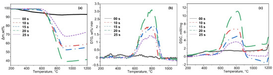 Experimental TG, DTG, and DSC curves for oxidation of the test samples are presented in Figure 2. Experimental data of the TG analysis show that an exothermic process begins at about 600 °C, ends at 900 °C, and is accompanied by weight loss. The greatest weight loss can be observed in samples processed for 20–25 s, where it amounts to ~60%. The weight loss for both 10 s and 15 s samples is ~40–45%. The smallest weight loss is observed for the sample at 25 s, since the graphite sinter was removed mechanically; this is confirmed by X-ray diffractometry in Figure 1. The initial sample (00 s) does not exhibit a pronounced exothermic weight loss, which can be explained by a different proportion of graphite in the materials (the initial slag does not contain graphite, the proportion of graphite is higher in the samples with a longer exposure time).