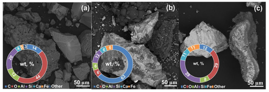 Figure 4a presents the results of scanning electron microscopy and energy dispersive analysis of the initial slag sample. The scanning electron microscopy of the initial sample revealed the presence of irregularly shaped crystalline particles. The spectra of the initial sample showed a significant amount of oxygen, silicon, carbon, aluminum, and a small amount of calcium, iron, sodium, magnesium, and some other elements with a content close to zero, which is characteristic of ash and slag waste samples [35], since ash and slag waste are inhomogeneous and vary in composition depending on the coal origin. Nevertheless, the literature data report the characteristic features of the qualitative composition of slag. Oxygen, aluminum, and silicon are the main components of ash. Slag also contains carbon, sodium, phosphorus, sulfur, potassium, calcium, titanium, iron, and some other elements in fractions of a percent [35,36]. Analysis of the data obtained in a series of EDX measurements of the chemical composition of the initial slag is shown in Figure 4a. The figure presents quantitative data on the content of the main elements, such as O, Al, Si, Ca, and Fe, in the form of a donut chart with averaged values for a series of measurements with a standard deviation. Na, Mg, P, S, and K were also identified in the material. The content of Ti, Mn, and Cu was negligible (not more than 1 wt %).