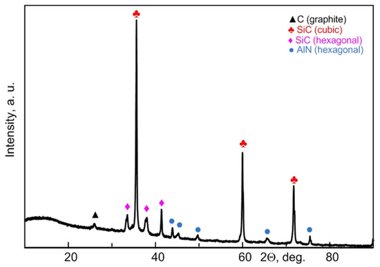 After a series of experiments performed based on the above data, the electric arc processing mode (current strength 220 A, arc duration 25 s) was chosen for the production of the raw material for subsequent studies, and it was purified from excess carbon. Figure 5 shows the XRD pattern of the sample accumulated for subsequent sintering. According to the XRD data, the sample contains hexagonal and cubic phases of silicon carbide, a hexagonal phase of aluminum nitride, and traces of carbon.