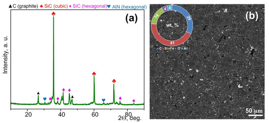 According to the XRD analysis (Figure 6a), the resulting material contains up to ~49.6 vol % of cubic silicon carbide, up to ~31.6 vol % of hexagonal silicon carbide, up to ~18.8 vol % of graphite, and peaks of aluminum nitride (Figure 6a). It should be noted that traces of silicon and iron oxides can be seen in the XRD pattern and SEM images of the obtained materials based on silicon carbide (Figure 6b).