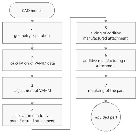 In addition to the advantages of rapid mould setting and thus the rapid production of new components, this technology also has certain disadvantages. For example, the interpolation layer not only leads to a smoothing of the discrete height jumps between the pins but also to a smoothing of desired edges. This means that only features with comparatively large radii can be produced. Similarly, fine details cannot be manufactured with this technology, as the pins and the interpolation layer specify the minimum size of the details. To solve these problems and thus expand the geometries that can be represented, Lušić et al. [12] propose the use of additively manufactured attachments. These attachments represent the areas of the mould that cannot be set by the VAMM machine. In Herzog and Tille [1], the boundary conditions were analysed, and the process called enhanced multipoint moulding with additive attachments (EMMA) was defined. Figure 1 illustrates the workflow for EMMA.