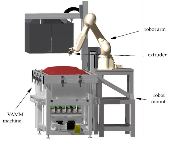 For the additive manufacturing of the attachments, an extruder of type Titan Aero manufactured by E3D-Online Ltd., Chalgrove, Oxfordshire, UK, is used. This is guided by a six-axis industrial robot of the type RS007LFF60 made by Kawasaki Heavy Industries, Ltd. [23], Chūō, Kobe, Japan. The robot is mounted on a stable construction of aluminium profiles, which is assembled directly to the VAMM machine and thus creates a fixed connection. Figure 2 shows a rendering of the complete experimental setup. In addition to the system components described, the radiant heating of the VAMM machine, which is not used in these experiments, is also shown.