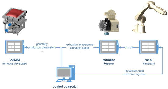 To make it as easy as possible to separate the individual parts of the system, they are each equipped with separate controls. The interaction of these controls is shown in Figure 3. The VAMM machine relies on a control system specifically developed for the system which, like the entire system, was taken over from Wimmer [10]. An adapted version (based on version 1.0.0) of Repetier from Hot-World GmbH & Co. KG [25], Willich, Germany, was used to control the extruder. In this setup, the parameters extrusion temperature and extrusion speed are fixed due to the limited communication possibilities between the robot control and the extruder control. The extruder is activated and deactivated via an on/off signal from the robot control. The robot controller in turn corresponds to the controller supplied with the robot.
