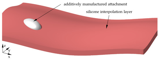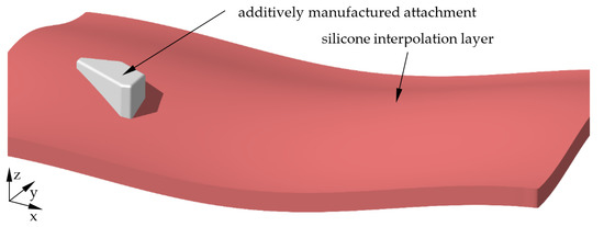 While the silicone interpolation layer itself has sufficient separating properties from the component and allows detachment, additional separating layers are necessary in the area of the additively manufactured attachments. For this purpose, the release wax type HP-G from HP-Textiles GmbH [31], Schapen, Germany, was used. In addition, a layer of cling film was added to prevent the resin from filling the pores of the additively manufactured attachments.