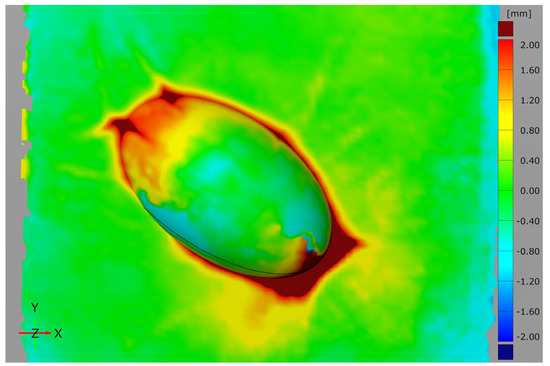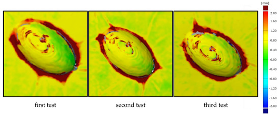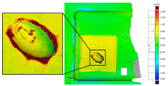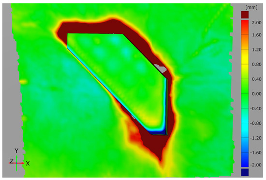 Figure 13 shows this surface comparison for the second test with the round geometry. It becomes clear that there is relatively good agreement with the target geometry overall. The deviations are again clearly visible in the area of the transition between the attachment and the basic geometry. Since the nominal geometry in this comparison refers to the mould, an offset in the material thickness is again to be expected here. However, this only occurs in the lateral areas of the attachment. The constant offset in the height direction (viewing direction) is omitted, as the comparison is made using a best-fit algorithm; thus, the height offset in this direction can be compensated. Slight positive deviations can be seen in the upper area. It is conceivable that the material is slightly less compressed during the manufacturing process or that the material is thickened due to a lower stretching of the fabric in this area. The slight deviations at the edge of the cut-out suggest a slight bulge in the interpolation layer in the area of the attachment, which also contributes to this.