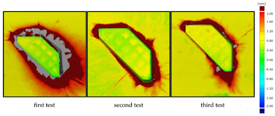 In addition to the round specimen geometry, the angular specimen geometry is also investigated. The surface comparison for the three tests is shown in Figure 10. Compared to the round specimen geometries, it is noticeable that the angular specimen geometry is significantly more difficult to mould and shows greater deviations between the scans. There is clearly more pronounced filleting at the transition between the interpolation layer and the additively manufactured attachment. Although the additively manufactured attachment complies with the demoulding slope of at least 1°–2.5° specified in VDI 2014 Part 2 [33], the corresponding minimum rounding with a radius of 5 mm at the transition of the moulded parts was not produced due to the expected stair-step effect. However, the dark red colouring extending far outwards confirms a filleting clearly above this. The areas missing in the scan (grey) result from the glossy surface of the part, which is discussed in detail in Section 3.2. The surface comparison also shows the significantly stronger wrinkling in the CFRP component, which is again due to the correlations already described. The smaller-than-expected deviations on the upper side of the attachment suggest that the vacuum here presses the test specimen evenly into the silicone mat. At the same time, the even colouring of the edges of the attachment indicates that the additively manufactured moulding attachment was not displaced here either.