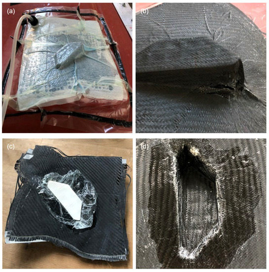Moulding result of the angular test specimen geometry (exemplary third test) (a) with vacuum build-up, (b) after removal of the vacuum bag, (c) after detachment of the CFRP component and (d) CFRP component in the area of the additively manufactured attachment.