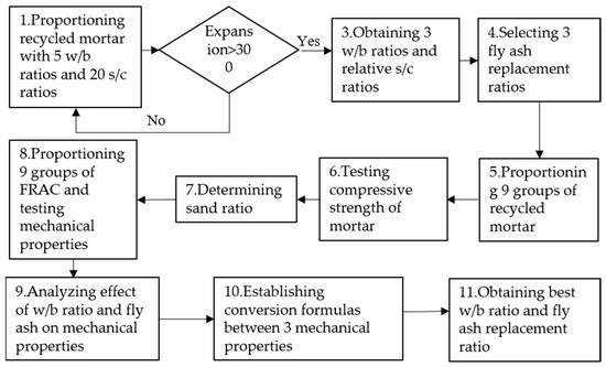On this basis, the influence of different water-binder ratios and fly ash replacement ratios on recycled mortar and FRAC made by this method was studied. The main research steps of the paper are shown in Figure 1. Based on this mixture design method, not only FRAC, but also recycled mortar with good workability can be prepared.