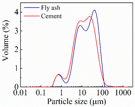 Grade 42.5 ordinary Portland cement and fly ash were used as binder materials. The physical properties and main chemical composition of cement and fly ash are listed in Table 1 and Table 2, respectively. The particle size distribution of both binder materials are listed in Table 3 and Figure 2. The particle size of fly ash is larger than that of cement. The CaO content of fly ash is 3.36% and the total sum of SiO2, Al2O3, Fe2O3, and SO3 is 91.303%. Therefore, the fly ash used in the paper belongs to class F, according to C618-19 [26] and GB/T 1596-2017 [27]. The fly ash replacement ratio, which is the ratio of the weight of fly ash to the weight of total cementitious material, is taken as 0, 20%, and 40%. RCA and RFA are derived from discarded laboratory concrete specimens. The waste concrete was crushed and screed to prepare as RCA (5–20 mm) and RFA (0–4.75 mm). The material properties of RCA and RFA are tested by the Chinese standard JGJ 52-2006 [29] and shown in Table 4. The crush index of RCA is 14.1%, which is higher than the crush index of NCA. The fineness modulus of RFA is 3.15, which is larger than 3, and therefore belongs to coarse sand. The surface of RFA is rougher than the NFA. The water-reducing rate of polycarboxylic acid water-reducing agent used in the experiment is 27%.