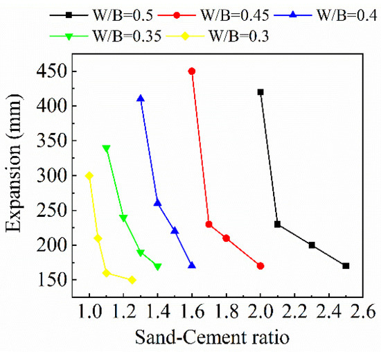 According to Table 5, the variation relationship between the expansion of mortar and sand-cement ratio under various w/b ratios is shown in Figure 3. Figure 3 shows that the mortar’s sand-cement ratio should decrease as the w/b ratio decreases.
