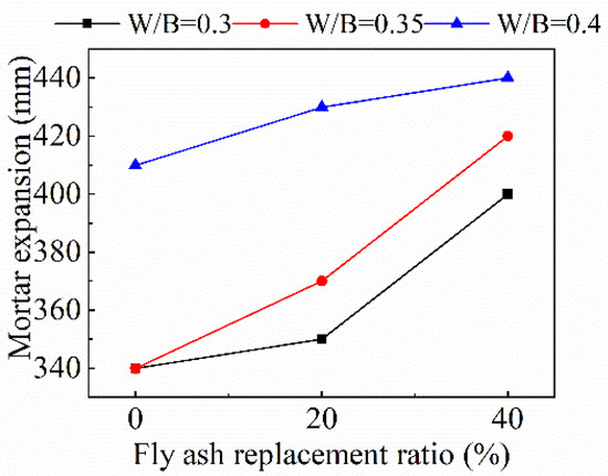 The variation of expansion with the fly ash replacement ratio is shown in Figure 4. As the fly ash replacement ratio increases, the expansion of the recycled mortar increases continuously, which shows that fly ash can effectively increase the fluidity of recycled mortar. This is because the shape of fly ash is mostly spherical [33], and the particle size of fly ash is also larger than cement. The addition of fly ash helps to improve the particle size distribution and the fluidity of mortar. In addition, fly ash reduces the flocculation of cement particles and plays a role in dilution [34]. However, when the w/b ratio is high, the increase of expansion is decreasing with the increase of the fly ash replacement ratio, which shows that the improvement effect of fly ash on the workability of mortar is more obvious when the w/b ratio is small. When the w/b ratio is 0.3, the increase of expansion from 300 mm to 400 mm is the most obvious as the fly ash replacement ratio increases from 0 to 40%.