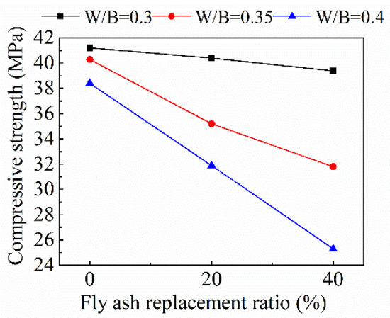 The variation of the compressive strength of recycled mortar with the fly ash replacement ratio under different w/b ratios is shown in Figure 5. The strength of recycled mortar decreases continuously with the increase of the fly ash replacement ratio. Since the active substances in fly ash that can participate in the hydration reaction are much smaller than those in cement, the increase of fly ash admixture will reduce the degree of the hydration reaction of the whole cementitious material, thus reducing the compressive strength of mortar. Moreover, with the increase of the w/b ratio, the decreasing effect of fly ash on compressive strength is more obvious. When the w/b ratio is 0.3, the compressive strength only decreases by 1.9%. When the w/b ratio increases to 0.4, the compressive strength is reduced by 34.1%. It can be seen from Figure 6 that the compressive strength of recycled mortar generally shows a downward trend as the w/b ratio increases, and the decreasing amplitude of compressive strength increases with the increase of the fly ash replacement ratio.