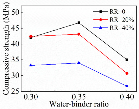 The variation of the compressive strength of FRAC with the w/b ratio is shown in Figure 7. When the w/b ratio increases, the variation trend of compressive strength is consistent. The compressive strength of FRAC increases first as the w/b ratio increases from 0.3 to 0.35, and subsequently decreases as the w/b ratio grows to 0.4. The increase in range was the highest when fly ash was not incorporated. The compressive strength of FRAC reached a climax when the w/b ratio was 0.35 and without adding fly ash. It is generally believed that the compressive strength of concrete will decrease with the increase of the w/b ratio. In this paper, the compressive strength of FRAC with a w/b ratio of 0.35 is higher than the other two types, while the compressive strength of recycled mortar with a water-binder ratio of 0.35 is lower than that of recycled mortar with a water-binder ratio of 0.3. The reason is that, when the w/b ratio is low, mortar is not sufficient to fully coat all RCA and the bonding effect between mortar and RCA is poor, thus compressive damage is mainly caused by the damage of mortar, the compressive strength of mortar, and is close to FRAC, even slightly higher than FRAC.
