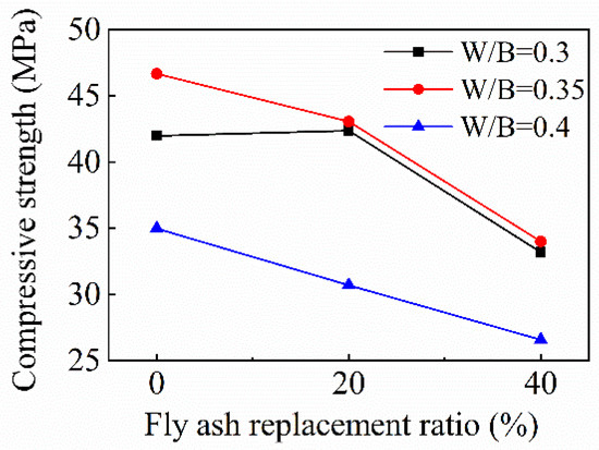According to the data in Table 7, the effect of the fly ash replacement ratio on the compressive strength of FRAC is shown in Figure 8. The compressive strength of FRAC decreases with the increase of the fly ash replacement ratio, except when the w/b ratio is 0.3; as the replacement ratio increases from 0 to 20%, the compressive strength of FRAC hardly changes. However, the compressive strength of FRAC with 40% fly ash decreases by 20.9%. When the w/b ratio is 0.35, the compressive strength reduces by 7.7% as the fly ash replacement ratio increases to 20%. the compressive strength of FRAC with 40% fly ash further decreases, by comparison with the FRAC without fly ash, and the compressive strength is reduced by 27.2%. When the w/b ratio increases to 0.4, the compressive strength decreases by 12.3% when the fly ash replacement ratio increases from 0 to 20%. When the replacement ratio increases to 40%, the compressive strength decreases by 24%, compared with FRAC without fly ash. Past studies have indicated that the compressive strength of concrete mixed with fly ash is quite different from that of plain concrete at 28 days, and the difference is gradually decreased at 90 days. The study by Saha et al. [35] indicated that the compressive strength of class F fly ash (calcium content 0.6%) concrete at 28 days decreased, and decreased sharply with the increase of the fly ash replacement ratio. The compressive strength of concrete with 20% and 40% fly ash at 28 days was 68.4% and 52.6% of the compressive strength of plain concrete. As the curing day increases to 90 days, the compressive strength development was 79% and 72.1% of the plain concrete compressive strength for the concrete with 20% and 40% fly ash. For FRAC, Corinaldesi et al. [36] studied the compressive strength of FRAC using 20% fly ash (calcium content 3.08%) and the cement at a 0.40 w/b ratio is 14.0% higher than plain FRAC. An investigation by Saravanakumar et al. [37] showed that the compressive strengths of FRAC mixed with 40%, 50%, and 60% fly ash (calcium content 1.07%) are 81.1%, 79.2%, and 65.8% of plain FRAC. Kurda et al. [38] calculated and fitted the compressive strength of 665 concrete mixed with fly ash and recycled aggregate. Fitting results showed that, when the replacement rate of coarse and fine recycled aggregate is 100%, the compressive strengths are 112.7% and 76.2% of the plain concrete compressive strength for the concrete with 20% and 40% fly ash. In this paper, only when the w/b ratio is 0.3, is the compressive strength of FRAC with 20% fly ash higher than that of plain FRAC. The ratio of the compressive strength of 40% fly ash FRAC to the compressive strength of plain FRAC is close to fitting the results of Kurda. The compressive strength ratios of 40% fly ash FRAC to plain FRAC under three w/b ratios are 79.0%, 72.8%, and 76.0%, respectively.