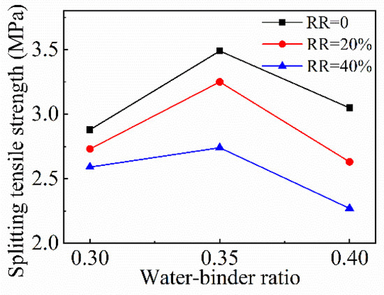 The ratio of the splitting tensile strength to compressive strength of FRAC is listed in Table 9. The ratio ranges from 6.4% to 8.7%, which is similar to the result reported by Tangchirapat et al. [43], but lower than the ratio of NAC (approximately 10%). However, the ratio is influenced by the w/b ratio; with a w/b ratio of 0.4, the value reaches the maximum. The reason is that, when the w/b ratio is 0.4, the compressive strength of FRAC is much lower than other groups, while the value of the splitting tensile strength under different w/b ratios changes little, thus making the value of this ratio change more.