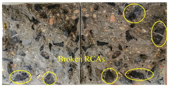 From Figure 10, the variation between the splitting tensile strength and the w/b ratio shows a tendency of first increasing and, succeeding that, decreasing as the w/b ratio increases. When the w/b ratio increases from 0.3 to 0.35, the corresponding increasing rates of splitting tensile strength were 21.2%, 19%, and 5.8% at the fly ash replacement ratios of 0, 20%, and 40%, respectively. As the w/b ratio grows to 0.4, the corresponding decreasing rates of splitting tensile strength were 12.6%, 19.1%, and 17.2% when the fly ash contents were 0, 20%, and 40%, respectively. From Figure 11, the splitting tensile destruction section is relatively smooth, and it is obvious that the RCAs in the yellow circles are split in two along the destruction section, which shows that RCAs bear the main tensile stress in splitting tensile failure.
