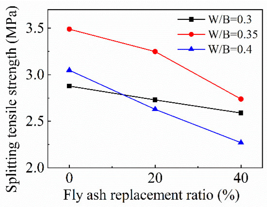 Figure 12 sketches the variation trend of splitting tensile strength with the fly ash replacement ratio. It is manifest that the splitting tensile strength decreases almost linearly when the fly ash replacement ratio increases continuously. When the w/b ratio is 0.35, the splitting tensile strength value is the highest and the decrease amplitude is the largest, when the fly ash replacement ratios are 20% and 40%, compared with that without fly ash, and the splitting tensile strengths decrease by 6.9% and 21.5%, respectively. The splitting tensile strength decreases the most slowly as the w/b ratio is 0.3, compared with that without fly ash; the splitting tensile strengths decrease by 5.2% and 10.1% as the fly ash replacement ratios increase to 20% and 40%. As the w/b ratio increases to 0.4, compared to the splitting tensile strength of FRAC without fly ash, the decreased rates are 13.7% and 25.5% as the fly ash replacement ratios of FRAC are 20% and 40%, respectively. The study by Hashmi et al. [42] indicates that, as the w/b ratio is 0.45, the splitting tensile strengths of fly ash concrete with 25%, 40%, and 60% of fly ash are observed as 86%, 79%, and 72% of plain concrete at 28 days. In this paper, when the w/b ratio is 0.4, the splitting tensile strengths of fly ash concrete with 20% and 40% of fly ash are 86.3% and 74.5% of plain concrete, which is close to results of Hashmi. Kurda et al. [38] who collected and fitted tensile strengths of RAC incorporated with fly ash. Fitting results showed that the tensile strength decreased with the increasing incorporation contents of fly ash. For FRAC, the tensile strengths of FRAC with 20% and 40% fly ash are 90.7% and 84.0% of plain concrete. In this paper, when the w/b ratio is 0.35, the splitting tensile strengths of FRAC with 20% and 40% fly ash are 93.1% and 78.5% of plain FRAC, which is closest to the fitting result. Furthermore, the effect of fly ash on the splitting tensile strength of FRAC is affected by the w/b ratio. It can be seen that, when the w/b ratio is relatively low, using fly ash instead of cement has less of an effect on splitting tensile strength compared to FRAC with a high w/b ratio.