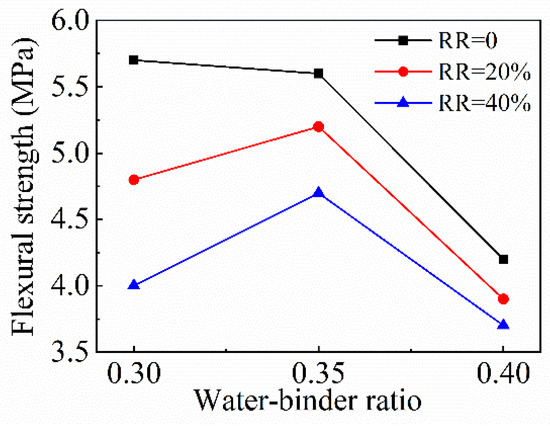 The effect of the w/b ratio on the flexural strength of FRAC is shown in Figure 13. Without the admixture of fly ash, the flexural strength decreases as the w/b ratio increases. When the w/b ratio increases from 0.3 to 0.35, the flexural strength decreases slightly, and the decreasing rate is 1.8%. When the w/b ratio increases from 0.35 to 0.4, the flexural strength decreases obviously by 25%. When the fly ash replacement ratios are 20% and 40%, the flexural strengths increase first and then decrease as the w/b ratios increase. When the w/b ratio increases from 0.3 to 0.35, the flexural strengths of FRAC with 20% and 40% fly ash replacement ratios increase by 8.3% and 17.5%, respectively. In the same fly ash replacement ratio, compared to FRAC with a w/b ratio of 0.3, the flexural strengths of FRAC with a w/b ratio of 0.4 decrease significantly by 25% and 21.3%, respectively. The flexural strength of most concrete tended to decrease at low w/b ratios [46]. In this test, the relationship between flexural strength and w/b ratio is similar to that of compressive strength and also proves that the mechanical properties of FRAC at a w/b ratio of 0.35 are the most excellent.