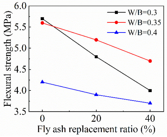 Figure 14 sketches the effect of the fly ash replacement ratio on the flexural strength of FRAC. According to this figure, with the increase of the fly ash replacement ratio, flexural strength presents a linear downward trend, and the decline amplitude gradually slows down with the increase of the w/b ratio. When the w/b ratio is 0.3, the decrease is the most obvious, compared with that without fly ash, the flexural strength of FRAC with 20% and 40% fly ash replacement ratios decrease by 15.8% and 29.8%, respectively. When the w/b ratio is 0.35 and the fly ash replacement ratios are 20% and 40%, the flexural strengths decrease by 7.1% and 16.1%, respectively. As the w/b ratio increases to 0.4, the values of the decreasing rates of flexural strength of FRAC with 20% and 40% replacement further reduce to 7.1% and 11.9%, respectively. The use of fly ash exerts a negative influence on the flexural strength of FRAC, and the effect is more pronounced at a low w/b ratio. The study by Barbuta et al. [47] showed that when the w/b ratio of is under 0.48, the flexural strength reaches the highest value when the concrete is mixed with 10% fly ash, which is 20.3% higher than that of plain concrete. The flexural strengths of concrete with 20% and 40% fly ash are obtained as 84.1% and 57.1% of plain concrete. An investigation by Siddique et al. [48] showed that the flexural strength decreased by 39%, 48%, and 56% as the cement was replaced with 35%, 45%, and 55% of class F fly ash. In this experiment, although the flexural strength of FRAC decreases with the increase of fly ash, the decrease is far less than the results of the above two tests.