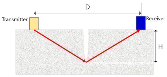 Sutan and Meganathan obtained UPV values by indirect penetration through one side of the concrete. Using this, we evaluated the accuracy of defect detection and depth measurement with a relational expression for calculating the depth of a void. The presence of the defect could be confirmed 100% of the time, but it showed accuracy in the range of 60–99% in evaluating the depth of the defect. Equation (3) below is a relational expression applied to check the depth of a void H, and Figure 1 shows a diagram of a crack detection experiment using an indirect transmission.