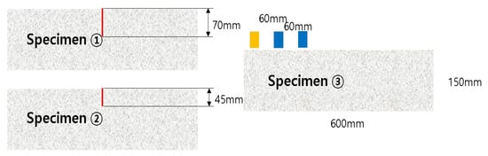 For the experiment, as shown in Figure 8, three concrete blocks with a size of 600 mm (L) × 200 mm (W) × 150 mm (H) and the same mixing ratio were manufactured. One of these is a block with no cracks on the surface and was used to check the UPV in a defect-free area. The other two have vertical cracks machined in the center with a width of 0.5 mm and depths of 45 mm and 70 mm, respectively. The accuracy of the relational expression for measuring depth was confirmed through the difference in propagation time of ultrasonic pulses when passing through cracks. The optimal test conditions that can be applied to the actual test conditions were confirmed by reflecting the ultrasonic delay inside the transducer.