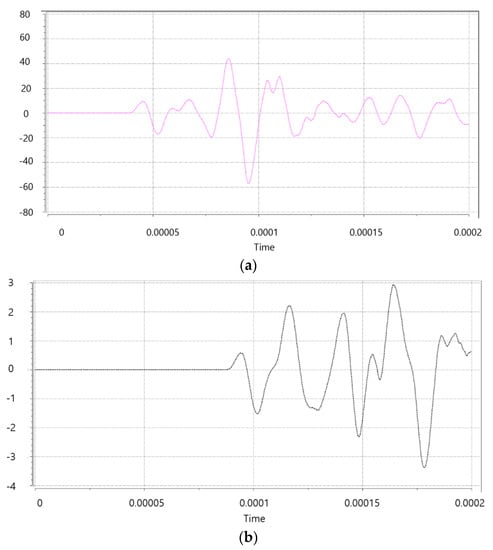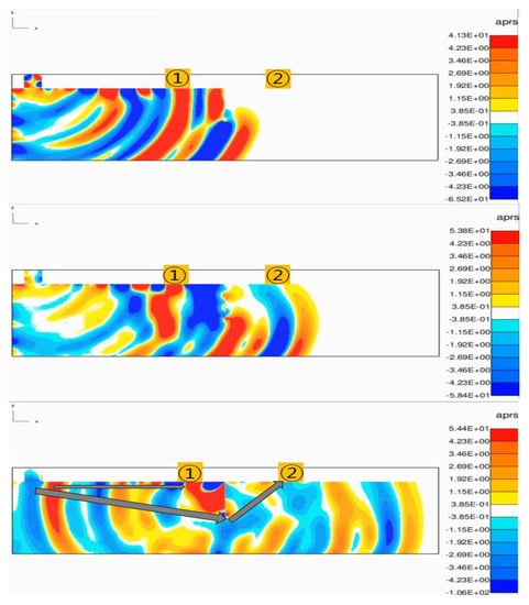 As shown in Figure 3, the TOF is the same up to Transmitter 1, but at Receiver 2 behind the crack, the ultrasonic wave is diffracted at the tip of the crack and propagates. It can be seen that the TOF increases as the movement distance of the pulse increases. The collected signals corresponding to the positions of receiver 1 and receiver 2 are shown in Figure 4.
