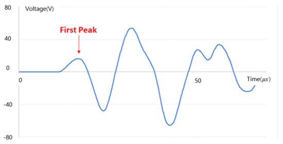 The propagation time (TOF) of the ultrasonic pulse was measured based on the first peak point of the pulse that appeared when the pulse reached the receiver, as shown in Figure 5. When the ultrasonic pulse oscillating from the transmitter travels and encounters a crack, it does not pass through the crack but is diffracted at the tip of the crack and propagates to the receiver. This extends the movement distance of the ultrasonic wave. The TOF increases when passing through the crack due to the increase in movement distance.