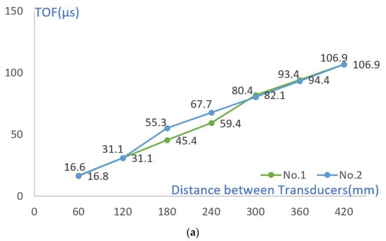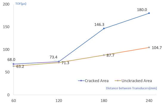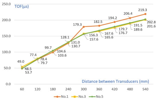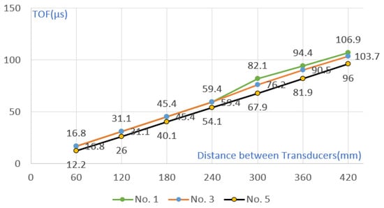 As shown in Table 8 and Figure 11, except for the crack section, the TOF increased at a constant slope as the transducer spacing increased in the remaining sections. Compared with the simulation results in Figure 6, the TOF value of No. 1 was higher than that of No. 3 and No. 5. However, unlike the simulation results that showed differences in Nos. 3 and 5, measurements were similar in the actual experiment. In addition, in the case of the TOF measurement value after cracking, it was possible to measure an approximate value when there was a crack in the simulation, but in the case of the actual experiment, even if there was a crack, the depth was measured.