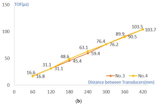 The TOF change with the difference in the distance between the transducer and the crack was compared under the condition of cracks of the same size. Cracks No. 1 and No. 3 are located at a distance of 270 mm from the transmitter, and No. 2 and No. 4 are located at a distance of 150 mm. In the section without cracks, TOF increased at a certain rate, but when passing through sections with cracks of 70 mm and 45 mm, TOF showed a larger value (see Figure 6 and Figure 7). However, after passing through each crack, it was confirmed that the cumulative TOF at a distance of 420 mm between the transmitter and the examiner was at a similar level. Through this, it was confirmed that the separation distance between the transducer and the crack did not affect the cumulative TOF.