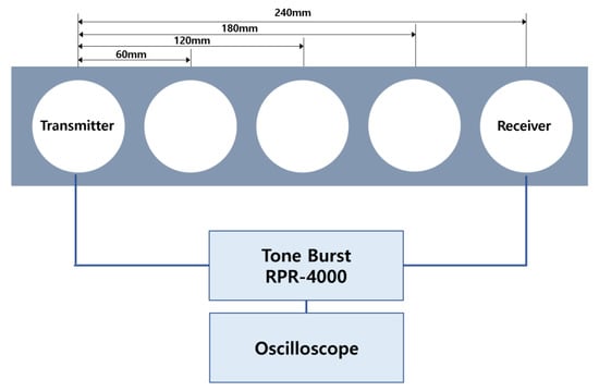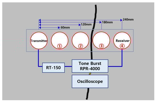 The transmitter and the receiver were separated by a distance. The surface of the concrete block was marked at intervals of 60 mm so that a constant value could always be obtained when measuring the ultrasonic speed. A diagram of the experimental apparatus is shown in Figure 9.