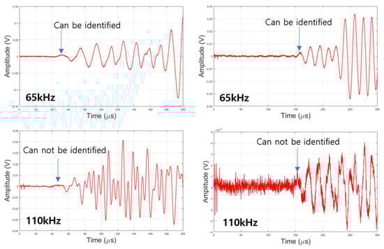 Since various materials such as aggregate and cement are mixed inside the concrete, the damping (scattering and absorption) is large. ASTM C597 requires using a resonant frequency in the range of 20 to 100 kHz, so it is easy to identify the first peak by selecting 65 kHz, which is within the frequency range required by ASTM C597. With 110 kHz, the resolution can be expected to be a little better in the simulation and experiment, so it was compared with 65 kHz. Signals using 65 kHz and 110 kHz are shown in Figure 10. When 110 kHz is used, it is difficult to distinguish the signals. This is in line with ASTM C597. Higher frequencies will only be applicable to concrete with low attenuation.