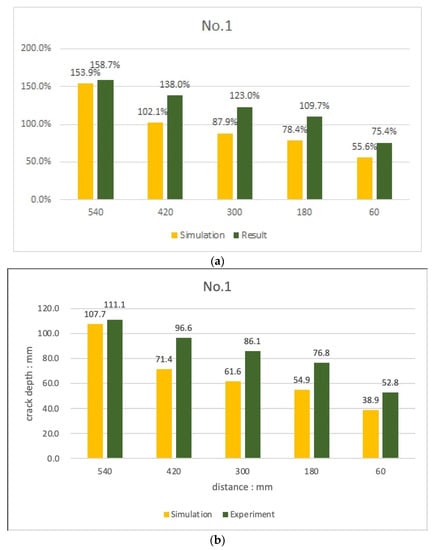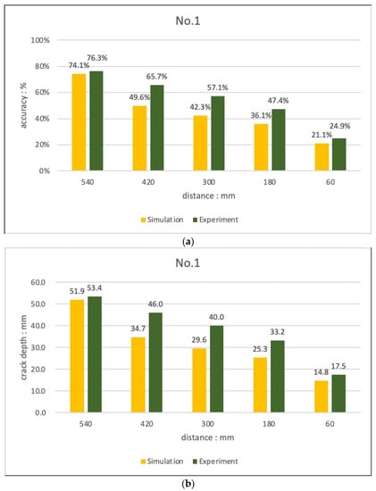 In the case of experiment No. 1, as shown in Figure 13, with the 70 mm crack condition, the depth of the crack was calculated with an accuracy of 75.4 to 158.7% depending on the depth of the crack and the distance between the probes. When a crack exists at a point 270 mm away from the transmitter, the depth of the crack was evaluated as the distance between the transducers increased. The value was calculated. In the case of a crack at 150 mm from the transmitter, the accuracy of the crack-depth evaluation was 80.1 to 102.6%, indicating a relatively even result.