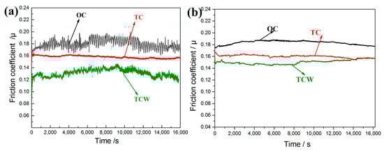 Figure 3 shows the friction coefficient of different cylinder samples at different temperatures during the friction and wear tests. It can be seen that the friction coefficient of the OC sample was the largest, and the friction coefficient of the TCW sample was the smallest, whether at high temperature or normal temperature. The average friction coefficients of the OC samples were almost the same at different temperatures, at about 0.18. The overall variation tendency of the friction coefficients was similar, increasing first and then decreasing. However, it can be clearly seen that the friction coefficient of the OC sample fluctuated greatly at high temperature, while it was relatively stable at room temperature. For the TC samples, the average friction coefficients were also the same, at about 0.16. Furthermore, both the friction coefficients were stable and smooth. The variation tendency was gradually decreasing. As for the TCW samples, the friction coefficients were obviously different at different temperatures. The average value was about 0.15 at room temperature, while it was only about 0.13 at high temperature. Additionally, the friction coefficient also showed a downward trend at high temperature; however, the friction coefficient experienced an upward trend at room temperature. Compared with the OC sample, the average friction coefficient of TCW samples at high temperature decreased by 27.8%, while the value only decreased by 16.7% at room temperature.