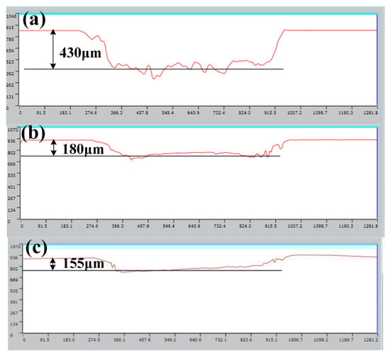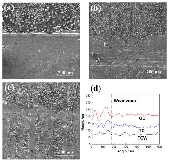 Due to the release of solid lubricant from the dimples on the surface during the experiment, the weight difference of the cylinder sample before and after the test includes the amount of wear of the cylinder sample and the amount of solid lubricant released. Therefore the weighing method cannot be adopted to characterize the wear amount of the cylinder sample. In addition, the wear amount of the cylinder is much smaller than that of the piston ring. Therefore, the wear amount of the piston ring sample, namely the height difference between the worn area and the unworn area, was employed to characterize the tribological properties to improve the accuracy of the test, as shown in Figure 4. It can be seen from Figure 4a,d that a micro-convex body was formed on the edge of the worn area of the piston ring corresponding to the OC sample, and the height of the micro-convex body was about 120 μm. Nevertheless, the worn area was relatively flat, indicating that serious wear occurred. The height of the micro-convex body of the piston rings corresponding to the TC and TCW samples were about 90 μm and 50 μm, respectively, as shown in Figure 4b,c. Therefore, the results show that the solid lubricant in the dimples on the surface of the cylinder can extremely improve the tribological properties of the cylinder and piston ring.